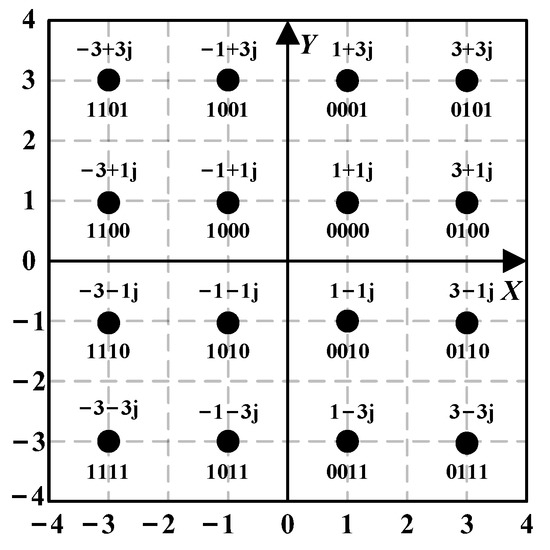 When , it is 16QAM modulation, which means that each QAM modulation symbol contains 4 information bits. Figure 4 shows the 16QAM modulation constellation mapping, where each modulation symbol corresponds to a Gray code in the constellation mapping. The 4-bit Gray code sequence is divided into real and imaginary parts, where represent the real part of the 16QAM symbol and represent the imaginary part. The number of real and imaginary bits is the same, which facilitates the subsequent decision calculation for soft demodulation.