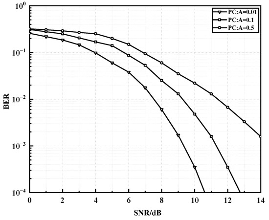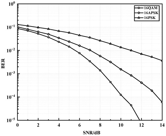 Modulation schemes of the same order are compared under an OFDM-PLC system using the same polar coding method and setting the improved impulse noise parameter to . Three types of modulation, 16QAM, 16APSK, and 16PSK, were evaluated, and the BER performance is shown in Figure 8. It can be seen that, as the SNR increases, 16QAM has the fastest decrease in BER, followed by 16APSK, and 16PSK has the slowest decrease. 16QAM has slightly better noise resistance than 16APSK and 16PSK in the same order. The performance of 16QAM is superior to 16APSK by about 1dB at BER of and by about 3 dB at BER of . As the SNR increases, the performance advantage of 16QAM is more obvious than that of 16APSK under the same polar code coding conditions. Because of the different constellation architectures, the minimum spacing of all adjacent constellation points in the QAM modulated constellation is the same, while the minimum spacing of adjacent constellation points in APSK modulated constellation is only equally spaced on the same circumference, so the distribution of QAM modulated symbols of the same order is more uniform than that of APSK. At the same time, as the modulation order increases, the number of APSK modulation radii of the same order increases, and the phase modulation level difference becomes larger, resulting in more difficult modulation and demodulation and lower modulation performance. However, when the load on the power line changes, channel distortion may occur. The 16QAM is the most sensitive to amplitude distortion because it has the most amplitude values, while 16PSK is the most sensitive to phase distortion because all its signal points are on the same circle, and the phase spacing between adjacent points is minimal. The sensitivity of 16APSK to both types of distortion is between 16QAM and 16PSK, and it is more balanced in terms of noise resistance and distortion resistance, making it more suitable for PLC communication systems.
