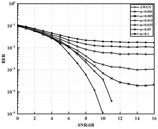 BER performance of polar codes under different impulse parameters m in the improved noise model.