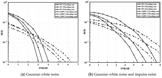 Finally, by simulating the analysis in Figure 6, Figure 7 and Figure 8, the transmission performance of different coding schemes under the OFDM-PLC-based system is focused on by selecting the high-order 16QAM modulation in the final system model and setting the improved impulse noise parameter . The BER performance of the polar and LDPC code schemes with three different coding rates (1/2, 5/8, and 3/4), respectively, and code lengths of 512 are compared under Gaussian white noise and improved impulse noise, where the LDPC code scheme is a combination of Approximate Lower Triangular (ALT) encoding and BP algorithm decoding has a maximum number of iterations of 50. As shown in Figure 9a, with the same code length, the decoding performance of both polar codes and LDPC codes deteriorates as the code rate increases under Gaussian white noise only. At BER of , the LDPC code and polar code with a code rate of 1/2 both have approximately 1 dB better performance than those with a code rate of 3/4. In the high SNR region, such as at a code rate of 3/4 and SNR > 3 dB, the decay slope of the polar code scheme increases significantly, and its error correction performance is enhanced. Similarly, for code rates of 1/2 and 5/8, the advantages of the polar code scheme over the LDPC scheme become more pronounced with increasing SNR. As shown in Figure 9b, when improved impulse noise is added on top of Gaussian white noise, at BER of and code rate of 1/2, both polar code and LDPC code schemes show approximately 2 dB performance reduction compared to that under Gaussian white noise only. However, at BER of and code rate of 5/8, the performance of LDPC codes with added impulse noise is reduced by more than 2 dB over Gaussian white noise only, which is greater than that of PC codes under the same conditions, and the trend becomes more pronounced as the code rate and SNR increase. The decay slope of the polar code scheme under impulse noise is greater than that of the LDPC code, and its error correction capability is significantly enhanced compared to that of the LDPC code scheme. Therefore, the polar code scheme shows better suppression of impulse noise than the LDPC code scheme.