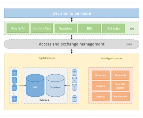 The proposed informed decision support framework (IDSF) for Saudi organizations, taking the health sector as an example, shown in Figure 2, outlines a comprehensive process for tackling strategic decisions at the operational, managerial, and strategic levels. The IDSF, comprising an informed decision support (IDS) committee, will be responsible for overseeing and implementing the framework. IDS will oversee and tackle strategic decisions and align with the organization’s leadership, graduating tracking sub-entities’ strategic decisions. IDS will act as a strategic informed decision support unit, capitalizing on the existing capabilities and resources to lead decision makers towards the best possible decisions