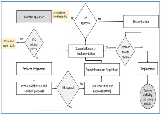 The process flow of the framework shown in Figure 3 is thorough, starting with the receipt of a problem or question from the leadership and proceeding through stages including problem definition, data requisition and approval, data acquisition, scenario/research implementation, and dissemination. Each stage is subject to review and approval by the IDS committee and relevant execution teams, ensuring that the process is well-coordinated and that decisions are thoroughly researched and evaluated, which answers the research question of how to assure decision accuracy through a proper process. The work involves the formulation of the problem, checks its feasibility to further report it as a problem statement, and finally carries out further checks on defining it and proposing the relevant solution for the same problems. After the solution is approved from IDS, the next step is to collect the data and information needed to formulate the research questions so that it can be implemented and approved for dissemination and for making further actions.