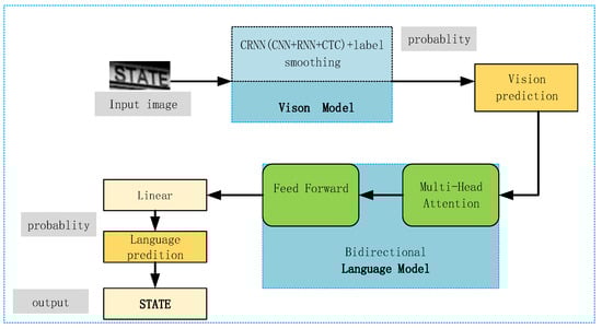In the CRNN network model, from the input image to the output text recognition result, it can be considered that the model applies feature information from the visual aspect to the text sequence recognition without applying feature information from other modalities. Considering that the overall recognition accuracy of the CRNN network model is still low and that relying on visual information from a single modality for text recognition is not informative enough, it is necessary to add other auxiliary information to improve the overall recognition accuracy based on the visual model effect. At this stage, linguistic features have been used to some effect in the text domain. Linguistic features refer to the consideration of the context between characters to infer the class of that character, rather than based on the glyphic features of the character. In this paper, we choose to add a linguistic model, a network model to obtain information relying on both visual and linguistic features rather than on visual features alone, and more comprehensive information acquisition, which helps to improve the accuracy of text recognition. The data used for text recognition are labeled data. Taking the English alphabet as an example: if it is not case sensitive, the English alphabet has 26 letters, and then considering the Arabic numerals 0–9, the whole data eventually correspond to 37 characters, so the text recognition problem is essentially a multivariate classification problem, with the option of adding label smoothing. Label smoothing is a regularization technique that ensures the generalization ability of the model and improves the resistance of the model to interference.
