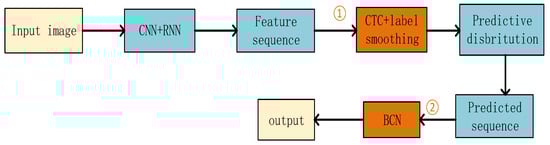 The adjustable parameter, in Equation (2) is used to balance the weight regularization term and CTC loss. From Equation (2), it can be intuitively seen that the whole loss function after adding label smoothing contains the CTC part and KL scatter part. Both parts are related to , and when takes 0 then it becomes , and when takes 1 then it becomes . The CRNN model diagram after adding label smoothing is shown in Figure 4.