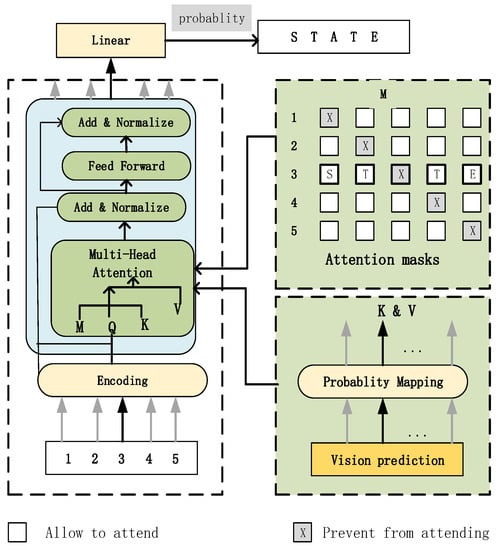 The BCN does not use self-attention to avoid information leakage across steps, and each time step of the BCN is computed independently and in parallel, which is efficient. The schematic diagram of adding the language model to CRNN is shown in Figure 6. Considering Figure 5 and Figure 6 together, it can be visualized that the prediction results from the visual model are input to the language model after masking, multi-headed attention, feed-forward network, and normalization to obtain the final prediction result STATE.