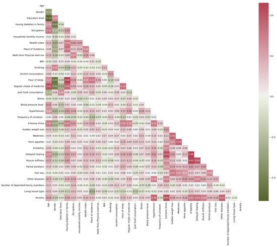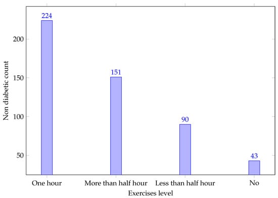 The number of people with diabetes who had a family history of the disease was significantly higher than the number of those without a family history of diabetes. Diabetes affected 223 individuals whose ancestors or parents had the condition, but only 52 individuals whose ancestors or parents did not have the disease. Figure 2 represents the correlation between the features. We found no significant correlation between the features. Therefore, we did not remove any characteristics from the dataset. Figure 3 depicts the association between the category of the output variable non-diabetes and the walk/run/physical exercise variable, indicating that a person has a higher likelihood of falling into the category of non-diabetes if they are physically active for at least one hour. We also saw that most diabetic observations involved higher blood pressure levels compared to non-diabetic observations.