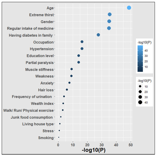 Figure 4 illustrates the associative features with T2DM using . The function changes the p value into a range of positive numbers that can be used to make good decisions for each feature. If the value of is greater than 1.301, then the feature is considered significant. Furthermore, a high value indicates a highly significant feature. The results show that age is the most significant element, whereas smoking is the least significant component. Other significant factors include extreme thirst, gender, regular intake of medicine, and having diabetes in the family; while stress and living house type are less significant.