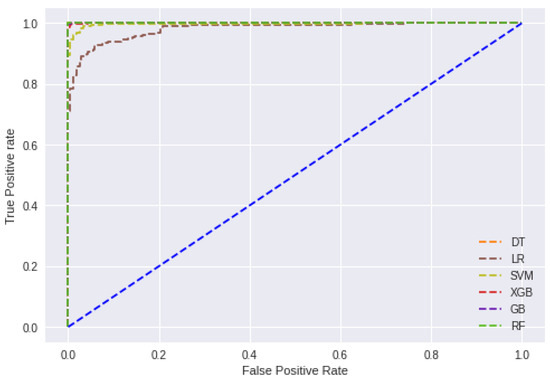 Our research also revealed the significance of features, estimated based on the mean coefficient value of every classifier employed. We calculated feature significance values for every method and then normalized them by applying the min–max technique to ensure that they ranged between 0 and 1. Next, we determined the mean scores for every characteristic. In Table 6, we examined the significance of the diabetic features and found that age was the most significant attribute (average coefficient value 0.99). Other crucial elements included having diabetes in the family, regular intake of medicine, extreme thirst, etc. The least important characteristics included muscle stiffness, living house type, stress, wealth index, etc. The ROC curves [65] for each classification method are shown in Figure 5. We observed that the ET classifier performed better than the rest of the classifiers in the ROC curves.