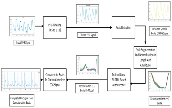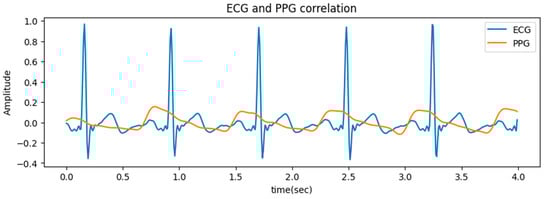 On the other side, PPG is a simple and cheap optical method that is used for detecting blood volume changes in microvascular tissue. The PPG waveform comprises a pulsatile (‘AC’) physiological waveform attributed to cardiac synchronous changes in the blood volume with each heartbeat and is superimposed on a slowly varying (‘DC’) baseline with various lower frequency components attributed to respiration, sympathetic nervous system activity, and thermoregulation [14]. PPG signal features are used in measuring respiration rate [15], heart rate [16], heart rate irregularity [17], blood pressure [18], blood oxygen saturation [19], and to assess vascular function [20]. Many devices, such as smartwatches and oximeters, used to measure PPG signals are cheaper and more comfortable compared to devices used to measure ECG signals. It is thus expected that PPG will be an alternative to ECG in heart-rate-variability monitoring [21]. Therefore, ECG signal inference from a simple measure of a PPG signal has become highly motivated recently. Fortunately, PPG and ECG signals are strongly correlated, as shown in Figure 1, because variation in the peripheral blood volume is a result of myocardial activities, and the electrical signals coming from the sinoatrial (SA) node regulate these activities. Some researchers have explored the relationship between ECG and PPG. For example, heart rates measured using ECG and PPG are strongly correlated. This means that PPG periodicity and ECG periodicity are highly correlated [22]. Moreover, PPG and ECG are correlated when an arrhythmia occurs [23]. Concerning the characteristics of a heartbeat, some important parameters of a PPG are also related to an ECG [24]. The PPG’s features can be used to estimate the PR, QRS, QT, and RR intervals of ECG. So, inferring the single-lead ECG signal from the corresponding PPG signal introduces simple single-lead ECG reconstruction from a single wearable sensor. Hence, the extensive clinical knowledge found in the reconstructed single-lead ECG signal helps to assess cardiovascular health more accurately.