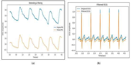 Example of band-pass filtering for the (a) PPG signal and (b) ECG signal.