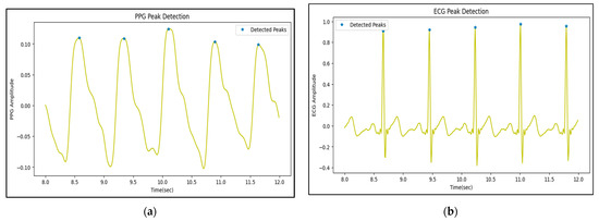 Example of peak detection for the (a) PPG signal and (b) ECG signal.