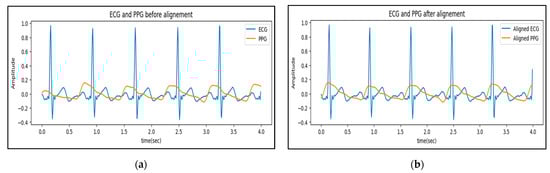 Example of corresponding PPG/ECG signals (a) before peak alignment and (b) after peak alignment.