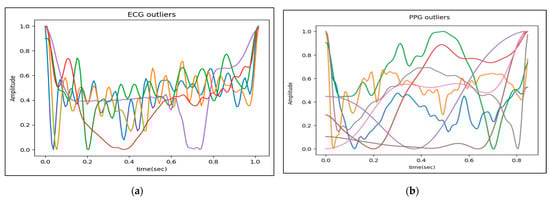 Example of noisy clustered signals of (a) ECG bad beats and (b) PPG bad beats.
