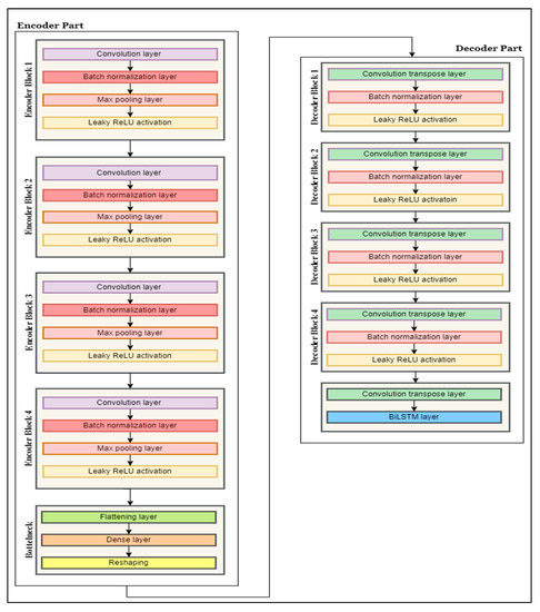 - The decoder part consists of four blocks followed by a convolution transpose layer and only one BiLSTM layer at the end. Each block of the decoder blocks consists of a convolution transpose layer and batch normalization followed by the Leaky ReLU activation function. The last layer is a BiLSTM layer that was chosen to make samples of reconstructed ECG beats related to each other. Other than normal LSTM, which can detect the dependency of the next sample on previous samples, the chosen BiLSTM can detect the dependency of the next samples on previous samples and vice versa.