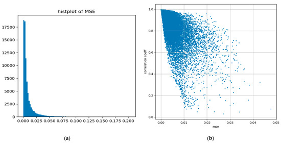 Model training and evaluation on the MIMIC II extracted dataset: (a) histogram of the MSE of test data; (b) scatter plot between r and MSE.