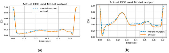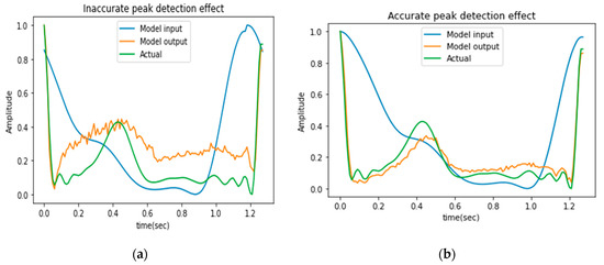 Figure 15. Effect of inaccurate peak detection: (a) model output in case of inaccurate peak detection and (b) model output in case of accurate peak detection. - As known ECG signals (lead II) have a large variation from one to another, so in a completely subject-independent training scheme, we have some limitations and conditions to obtain good results. Training and testing datasets should come from people with the same gender and same health status; their ages should also be near to each other. The previous condition ensures that the variation between testing and training can be captured by the deep learning model. This limitation will be addressed in future work by using deep learning generalization techniques and searching for a large dataset that meets the previous conditions.