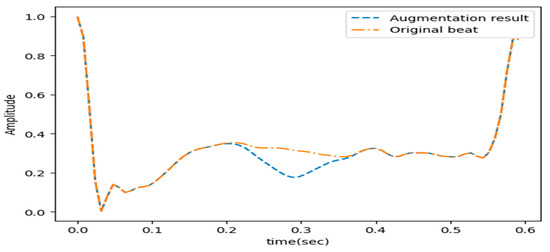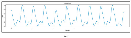 At this time, we trained the model on subject beats from the MIMIC dataset that has CHF (congestive heart failure). The training subject is male and is 84-years-old, whereas the model is tested on another subject (male, 73-years-old) from the MIMIC dataset, which also has CHF. ECG and PPG signals were preprocessed as mentioned in Section 3 but along with an additional data augmentation step. There are many models for data augmentation suitable for ECG signals [47]. It includes adding some shapes (sine, square, or random noise) to some random intervals of the signal/beat. However, in this paper, we selected to add a Gaussian shape to some intervals in each beat in the ECG and PPG beats. It is worth mentioning that the randomness of adding a Gaussian shape to ECG beats is independent of the randomness of adding a Gaussian shape to PPG beats. This helps in obtaining some shape of ECG and PPG that is not found in the original training dataset and is similar to the test dataset. Then, we choose 5000 beats from the training person after augmentation and tested the model on about 6000 beats from the test person. That augmentation step results in posting Pearson’s correlation coefficient.