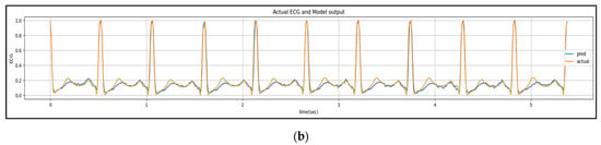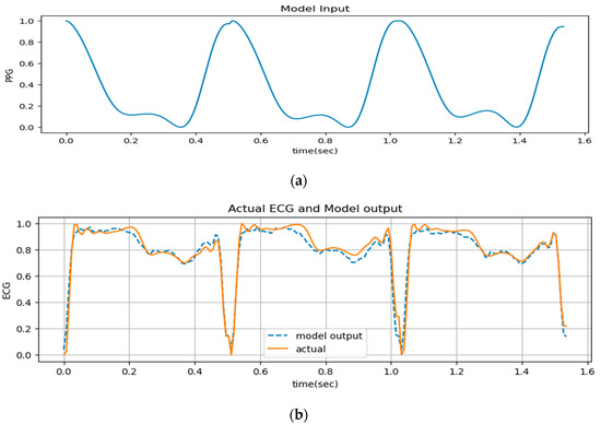 Signals after beat concatenation: (a) PPG input of our dataset example; (b) ECG (lead II) actual and predicted by the model output of our dataset example.