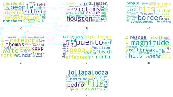 Word clouds of different disasters: (a) California Wildfire, (b) Hurricane Harvey, (c) Iraq–Iran Earthquake, (d) Hurricane Irma, (e) Hurricane Maria, (f) Mexico Earthquake, and (g) Sri Lanka Flood.