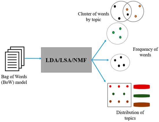 The computational complexity of NMF primarily depends on the size of the input matrix , typically denoted as , where is the number of documents and is the vocabulary size. The time complexity of NMF depends on the number of iterations required for convergence and the dimensionality of the factor matrices and . The most time-consuming step in NMF is the iterative update of the factor matrices. The computational complexity of this step is typically expressed as , where is the number of topics and is the number of iterations required for convergence. This complexity makes NMF computationally efficient for large-scale datasets compared to LDA, which involves a more complex generative process, and LSA, which requires the calculation of SVD. Figure 2 shows a generic pictorial representation of the topic modeling techniques adopted in this study.