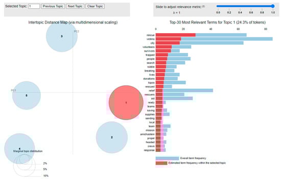 LDA, LSA, and NMF are highly suitable for analyzing disaster-related tweets. LDA, with its ability to identify latent topics within a collection of documents, can uncover the underlying themes and discussions present in disaster-related tweets. By inferring topic distributions for each tweet and word distributions for each topic, LDA enables the automatic identification of critical factors and issues. LSA, on the other hand, analyzes the co-occurrence patterns of words across a document collection to capture the semantic relationships between terms and documents. By reducing the dimensionality of the term-document matrix through SVD, LSA allows for the identification of related topics and the discovery of underlying meaning in disaster-related tweets. NMF, with its non-negativity constraints, is well-suited for analyzing disaster-related tweets due to its ability to generate sparse and interpretable representations. By decomposing the term–document matrix into non-negative factors, NMF enables the identification of key topics and their associated word distributions. All of these approaches are highly valuable for extracting critical factors and issues from the tweet data, allowing emergency response planners and decision-makers to gain a comprehensive understanding of the challenges faced by affected individuals and guide their planning and response strategies accordingly. Figure 3 shows a sample intertopic distance map and relevant topics list from a processed disaster dataset that was generated using LDA.
