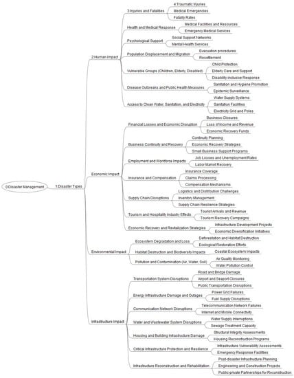 A comprehensive analysis of the collected tweets was first conducted to identify common themes, topics, and categories that emerged from the data. Four levels were created that more accurately capture the complexities and interrelationships. Level 0 serves as the overarching category that encompasses all aspects related to managing and responding to disasters. It sets the foundation for the taxonomy and provides a broad framework for understanding and organizing the various elements of disaster management. Level 1 classifies different types of disasters, including hurricanes and earthquakes. This level helps in distinguishing the specific context and characteristics of each type of disaster, facilitating targeted analysis and response strategies. Level 2 expands upon the broader categories of impact resulting from disasters. It recognizes that disasters have multi-dimensional consequences and identifies four key areas of impact: human, economic, environmental, and infrastructure. This level highlights the interconnectedness of these impacts and their significance in disaster management. Level 3 delves deeper into each of the four areas of impact identified in Level 2. It provides a more granular breakdown of the specific aspects and factors within each impact category. For example, under Human Impact, it includes subcategories such as injuries and fatalities, health and medical response, psychosocial support, population displacement and migration, vulnerable groups, disease outbreaks and public health measures, and access to clean water, sanitation, and electricity. Finally, level 4 (within each Level 3 category) further elaborates on the specific topics and issues within each Level 3 subcategory. It allows for a more detailed exploration of the nuances and intricacies of each aspect of disaster impact. For instance, under the subcategory of Injuries and Fatalities (within Human Impact), specific topics may include traumatic injuries, medical emergencies, and fatality rates (see Figure 4 for more details).