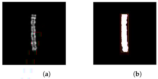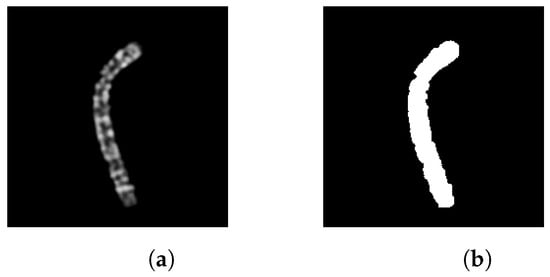 First, the chromosome grayscale image needs to be binarized. For the dataset in use, we adopted the same binarization technique described in the data augmentation section, so all the pixels greater than 0 are set to 1. The resulting binary image has a black background and a white chromosome, as shown in Figure 4. Then, it is cropped to retain only the chromosome.