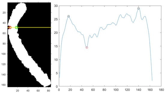In Equations (6) and (7), and represent the values of the two locally global maxima, while represents the value of the global minimum located between them. describes the relation between the two maxima: if they have similar amplitudes, then will be smaller. describes the relative amplitude of the global minimum between the two maxima. In Equation (5), and are the tuning parameters whose selection influences the location of the bending centre. The location of the global minimum point in the horizontal projection vector identifies the bending axis of the chromosome, i.e., a horizontal line that divides the chromosome into two arms; the outermost point of intersection between the chromosome and the bending axis is the actual bending centre of the chromosome. The opposite point, i.e., the last chromosome pixel along the same bending axis with respect to the bending centre, we called unjoined point, which will be used in a further process. An idea of the process explained above is presented in Algorithm 2.