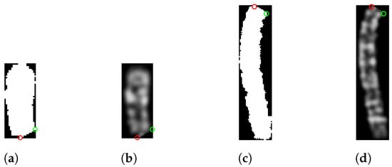 To improve classification accuracy, we added some check conditions to the straightening algorithm; not all bent chromosomes can be effectively straightened due to their particular shapes and the effects of the weights and in Equation (5). In general, we consider an effective straightening to be one in which the chromosome arms are vertical and oriented correctly (i.e., not upside down). Thus, we check the relative location of the bending center and the unjoined point in both the upper and lower arm images; if these conditions are not met, the algorithm stops and returns the original chromosome image. This approach avoids incorrectly straightening 447 chromosomes, resulting in a more robust dataset composed of original and well-straightened images.