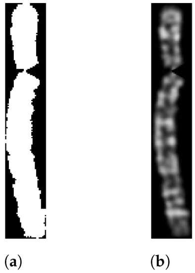 (a) Binary and (b) grayscale image of the straightened chromosome.