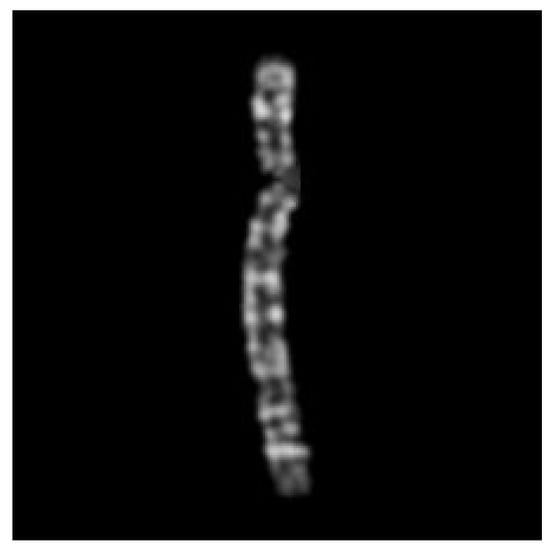 The dataset used in this study was obtained from Lin et al.’s GitHub repository (https://github.com/CloudDataLab/CIR-Net (accessed on 1 June 2023)), and it contains 2986 G-band chromosome images. They represent 65 different karyotypes, of which 32 are male and 33 are female; in particular, the dataset consists of 130 chromosomes per label from 1 to 22, except for labels 8, 12, 16, and 19, which are associated with only 129 chromosomes. Sex chromosomes are composed of 98 type X chromosomes labeled to 23, and 32 type Y chromosomes labeled to 24. The images are grayscale with 8-bit color depth, which means pixels have an intensity range from 0 (black) to 255 (white). The size is 224 × 224 pixels, with the background being black and the chromosome composed of shades of gray. Figure 2a illustrates an image of a type 8 chromosome from the dataset.