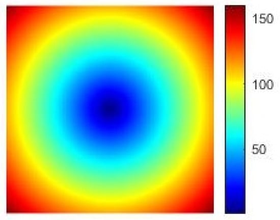 Figure 12. The distance matrix R. - Select a radius (threshold) and set to zero the values of the mask inside this radius using the values of distance matrix R as coordinates.