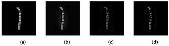 Figure 13. (a) Type 6 chromosome image and the corresponding results after applying (b) first technique, (c) second technique, and (d) third technique.
