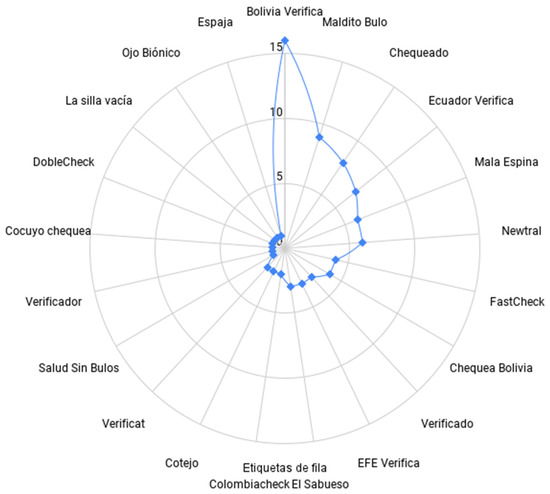 The verification agencies that issue the most notes are Bolivia Verifica (19.5%), Maldita (11%), and Chequeado (9.81%), three references for international fact-checking members of the IFCN, the regulatory body of the verifiers. There are some organizations analyzed that do not publish checks on their pages, such as Reverso (Argentina), Ecuador Chequea (Ecuador), and RedCheq (Colombia). In this line, we find Fake News hunters, Dinemos’s Checking, El Polígrafo, FactCheckingCL, Fake News Report and La Ter Third Fact-Checking in Chile and Health with Magnifying Glass and #ConvocaVerifica in Peru.