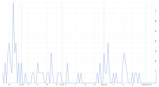 The chronological evolution of the denials states that May was the month with the highest number of verifications, 36.6% (30), followed by the months of August, 29.2% (24), and June, 24.5% (20). The figure decreased significantly in July, 8.5% (7), and in September, 1.2% (1), although this last month has limited data as the closing of the work is 14 September 2022. As depicted in Chart 1, the days with the highest content disputed in May are 26 (8), 28 (4), 23 (4), and 22 (3), as well as on 4 August (4), as shown in Figure 3.