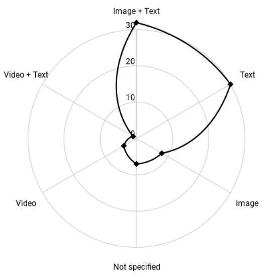 The highlighted format Is a combination of image and text in 39% of cases. Text is also predominant when used at 36.6%, while others such as the image (9.8%), the video (4.9%), and the video with text in the publication (1.2%) do not stand out. A high percentage is found in the ‘unspecified’ category (8.5%) since the weekly disinformation collections that have been submitted by several verifiers during the outbreak have been included in this category. This content does not refer to the features that pertain to the format, as shown in Figure 4.