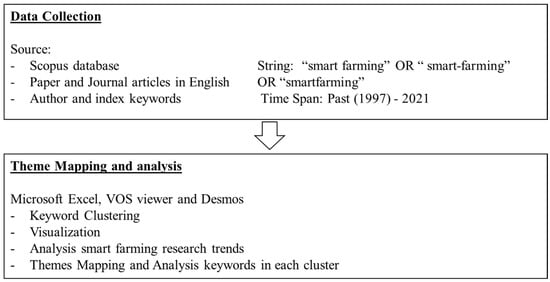 We used the VOS Viewer application to present a bibliometric analysis from the Scopus database in the publication period 1997–2021. VOS Viewer is a meta-analytical tool which can provide information regarding interconnections between research articles in specific terms and their topics. The use of VOS Viewer in bibliometrics studies of smart farming can provide information regarding the most cited articles regarding specific terms and topics and visualize them with a graph of citations related to smart farming. VOS Viewer can assist researchers in analyzing a broad range of bibliometric networks with its keyword analysis in terms of interconnection for each specific topic [26,27].
