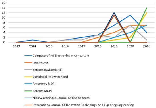 Figure 4 examines the publication of articles on smart farming from 2013–2021 and their indexing in the Scopus database; there were 129 papers published in the top eight journals in this field. None of these journals were used in the research prior to 2013. The top four journals, in terms of number of papers published, were Computers and Electronics in Agriculture (29 papers), IEEE Access (20 papers), Sensors Switzerland (15 papers), and Sustainability Switzerland (15 papers). Table 2 provides further details, including the total number of articles published, the name of each journal, and the number of articles published per year in each journal.
