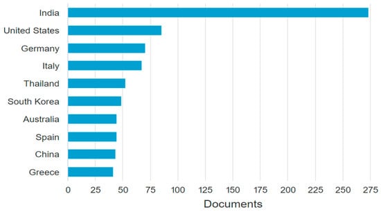 According to the data, 82 countries have contributed to the publication of journal articles on smart farming. The top 10 most productive countries in smart farming research are shown in Figure 5, with India having the highest number of publications, followed by the United States and Germany. India alone accounts for more than one-fifth (23.6%) of worldwide publications on the topic. The total number of journal articles related to smart farming published by these three countries was more than four-fifths (76.4%) of world productivity.