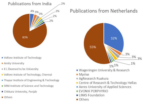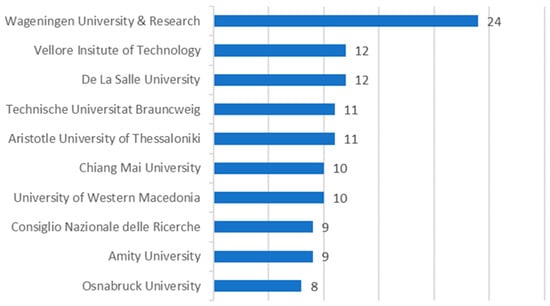 Figure 6 reveals the most productive institutions in smart farming research publications based on Pub data, led by Wagenigen University and Research, with 24 articles published in this field. The second and third most active institutions are Vellore Institute of Technology and De La Salle University, both with 12 articles published. Figure 7 shows that the majority of these top 10 institutions are from Europe (62.9%), while the remaining institutions are from Asia (37.1%). The characteristics of smart farming publications released by the 10 most active institutions are summarized in Table 3. Institutions from The Netherlands dominate the research activity in this field, while those located in India, the world’s most productive nation, did not make it to the top 10 list. This is because research on smart farming is distributed more evenly in India, which may explain why there are not as many well-known institutes in this sector compared to The Netherlands.
