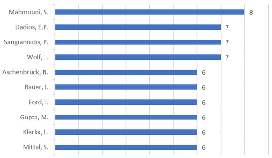 Figure 8 dis plays the top 10 most productive authors in smart farming research. Among them, Mahmoudi, S.; Dadios, E.P.; Sarigianidis, P.; and Wolf, L. had the highest number of publications, with eight articles each. The remaining authors ranked second and have published six journal articles each. Table 4 summarizes the number of articles and citations from these authors across four different periods. Interestingly, the authors with the most publications are not necessarily the ones with the most citations. These top authors started their research in the field of smart farming in 2017.