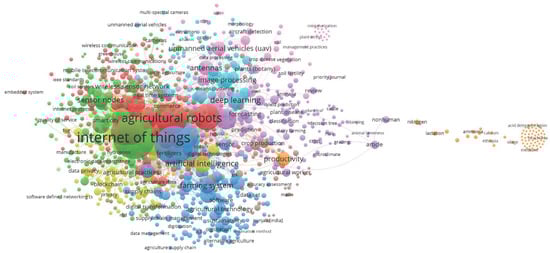 Figure 9 displays the co-occurrence network cluster visualization generated using the VOS Viewer tool. The largest bubble represents IoT, agricultural robots, and smart agriculture, with each cluster showing the relationships between the cited documents based on the frequency of their co-occurrence, as shown in Table 6. The research on IoT in the context of smart farming is a major area of investigation. The left and right bubbles relate to technology to support smart farming and biotechnology. The big bubbles for IoT and agricultural robots indicate their prominence in the field, while the lack of connections between some keywords suggests opportunities for further research.