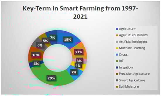 Authors’ keywords and index keywords from bibliographic records were grouped in order to fully capture the topic map of smart farming research. Table 6 presents the total number of key terms, as well as the quantity and proportion of categorized key terms for eight periods (1997–2015, 2016, 2017, 2018, 2019, 2020, 2021, and 1997–2021). Figure 9 shows the number and percentage of key terms classified in each cluster for the data period 2009–2018. IoT emerged as the most prominent key term in smart farming research, aligning with the concept of Industry 4.0. Additionally, specific key terms related to plant-based smart farming research, such as soybeans, show potential for further investigation. Term such as “cloud computing”, “middleware”, “big data”, “decision support systems”, “communication protocols”, “wireless sensor and actuator networks—WSANs”, and “integrated farm management” had a number of occurrences less than 90. Artificial intelligence was ranked 10 with a percentage of 3%, and had a number of occurrences of 90.