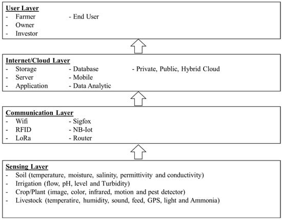 The agriculture sector has experienced significant influence from the development of the IoT in recent years. This influence has resulted in the emergence of the theme “Smart Farming”, which involves the application of intelligent information and ICT systems such as Artificial Intelligence (AI) to optimize the production of farm products [8]. With the integration of ICT into agriculture, the development of technology to support the potential benefits of smart farming systems has become a motivating factor for numerous studies, practitioners, and both private and public companies [9]. Based on research findings from [6,7], smart farming systems present numerous areas for exploration, such as smart systems for monitoring and controlling agricultural parameters, automated smart systems to enhance efficiency and reduce human interactions, and smart systems for green urban environments. The primary objective is to integrate ICT technology with existing agricultural systems to enable broad connectivity across the globe. In recent years, IoT solutions for smart farming have been reviewed in a number of publications, indicating constant contributions and improvement. A review paper by Villa Henriksen et al. [10] investigates smart farming research from 2008 to 2018; examines communication technologies and protocols, data analysis, and collection, IoT architecture and applications; and highlights the future prospects pertaining to the use of IoT technology in agriculture. A review paper by Ray [11] presents the technology used for data collection and communication within IoT solutions for smart farming, as well as several cloud-based IoT solutions for smart farming. Several cases were also presented for the identified applications of the IoT in smart farming. The review [12] presents a systematic review of papers published from 2006 to 2016, which are classified by application domains, such as prediction, logistic, monitoring, and controlling. Within these domains, the data visualization strategies and the technology used for edge computing and communication were also identified. A study by Tzounis et al. [13] examined the papers published from 2010 to 2016, which relied on an IoT architecture with three layers, namely application, perception, and network. The papers were further reviewed in terms of applications, network technologies, and perception devices. These studies identified embedded communication technology and platforms used in providing solutions to IoT applications. Unmanned aerial (UAV) devices, network technologies, embedded systems platforms, network topologies and protocols, and supporting cloud platforms were frequently covered in previous studies. Finally, the authors of [14] analyzed the reviewed papers published from 2010 to 2015 to show the state of the art of IoT in smart farming. The studies referred to IoT architecture with three layers (application, network, and perception) to analyze the application of actuators, sensors, technology with several farming domains, food consumption, livestock farming, and agriculture.