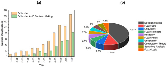 (a) Number of publications on Z-numbers from the Scopus database (2011–2022). (b) Top 10 keywords related to Z-numbers.