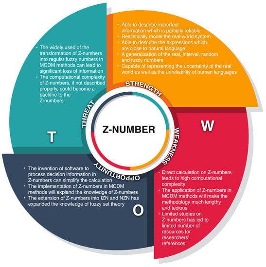 On the other hand, this review paper is more focused on the application of Z-numbers in decision making, with strength, weakness, opportunity, and threat (SWOT) analysis being conducted to evaluate the features of Z-numbers in solving real-world problems. It is believed that each multi-criteria decision-making (MCDM) method has its strength and weakness. Hence, existing MCDM methods based on Z-numbers were explored in this research to make comparative evaluations of the advantages and disadvantages of each of them. Based on the comparative analysis, the strength of each method was identified for the implementation in the development of the MCDM method based on Z-numbers in the future. In fact, the existing MCDM methods are either based on direct computation on Z-numbers or their conversion into regular fuzzy numbers. Both approaches were analyzed to identify the strengths and weaknesses of each approach.