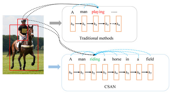 The majority of existing image captioning methods follow the encoder–decoder framework [1,2,3,4,5,6,7,8,9,10,11,12,13,14], where the encoder first employs a convolutional neural network (CNN) to extract visual features of an input image and the decoder mainly utilizes a recurrent neural network (RNN) to generate a descriptive sentence for the given image. Later, attention mechanisms [15] were introduced in the encoder and decoder, which were firstly applied in machine translation, and achieved great improvements in image captioning. With the advance of Transformer, many transformer-based architecture models [16,17,18] were proposed and great improvements made in image captioning. For example, DLCT [16] explores the intrinsic properties of region and grid features for image captioning. However, these captioning methods [19,20,21,22] predict the current word depending on the previously generated words, which results in a lack of context semantic information in the model, as illustrated in Figure 1.