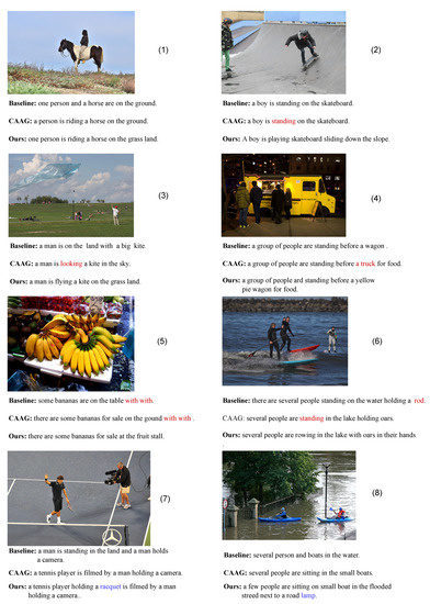In the first image, the baseline method generated a correct caption sentence by listing the contents of the image. However, it failed to capture the relationship between the “person” and the “horse”, specifically the action of “riding”. In contrast, both CCAG and CSAN, which leverage context semantic information, accurately generated the term “riding”. This clearly demonstrates the effectiveness of context semantic information in generating accurate and contextually relevant caption sentences. By considering the contextual relationships and semantic information, CCAG and CSAN are able to produce captions that capture not just the objects in the image but also their relationships and actions, resulting in more comprehensive and accurate descriptions.