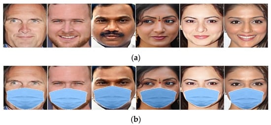 Part image example of MASK600 [] (a) original face image without a mask (b) synthetic face image with the mask.