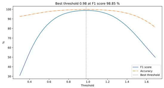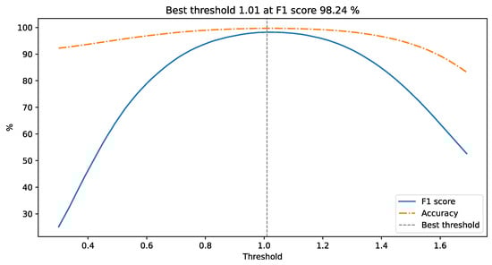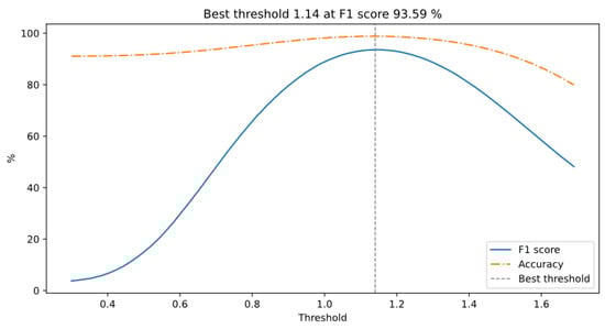 Then the comparisons of the average F1 score and accuracy of the model under different Th are shown in Figure 7, Figure 8 and Figure 9 under different Th. after training for 100 epochs. Due to the unevenness of the positive and negative sample size, the accuracy of the model does not vary significantly outside of very small or large Th. The F1 score varies significantly with the change in Th. Therefore, the best F1 score was used to find the most suitable Th. in this research. From Figure 7, Figure 8 and Figure 9, it is observed that the best value of Th for the InceptionResNetV2 model, the InceptionV3 model, and the MobileNetV2 model are 0.98, 1.01 and 1.14, respectively.